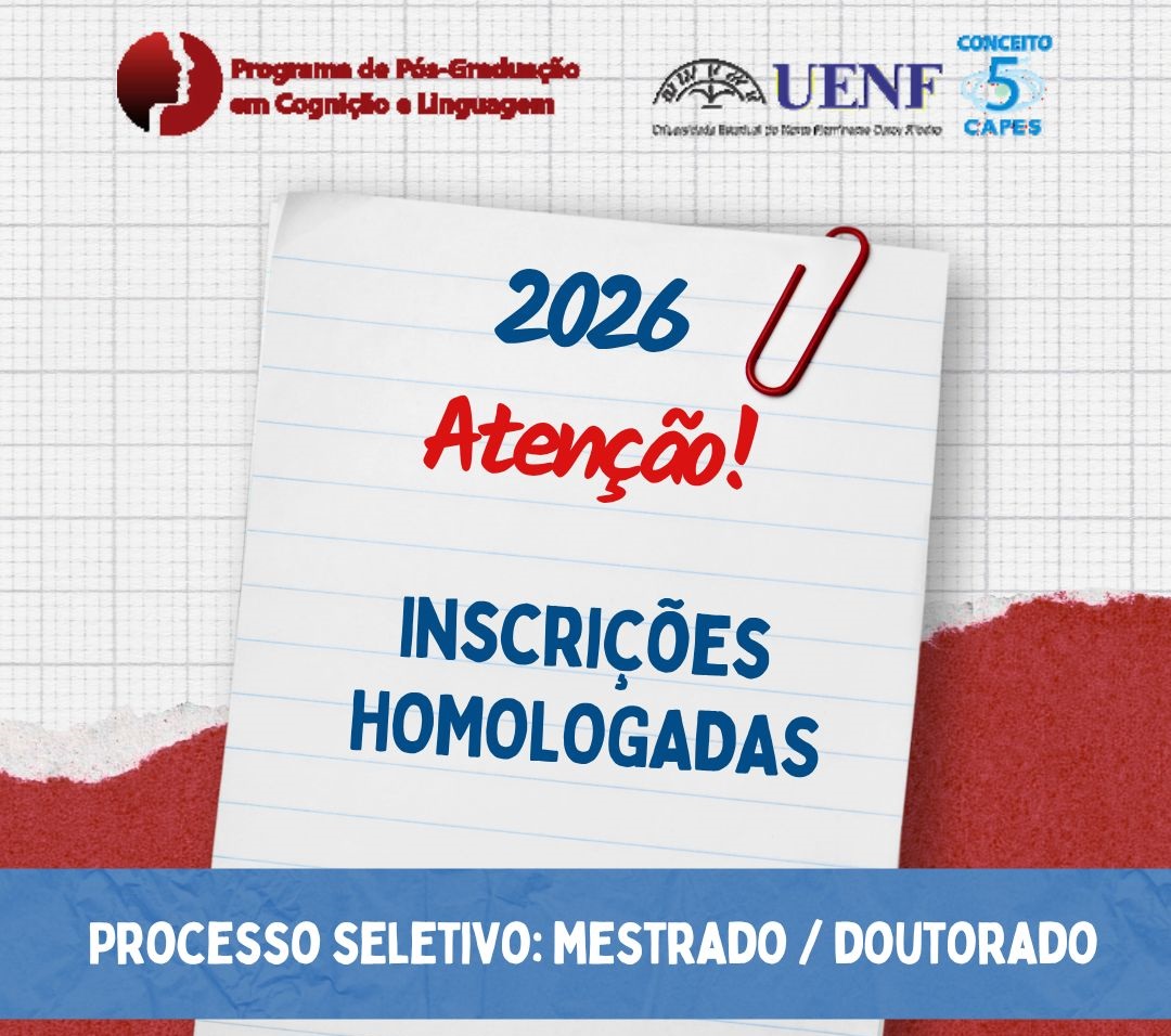 A lista de inscrições homologadas para o Processo Seletivo 2026 – Mestrado e Doutorado do Programa de Pós-Graduação em Cognição e Linguagem (PGCL/UENF) já está disponível! 📝